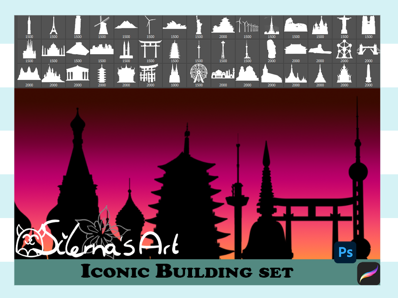 45 iconic building stamp brushes for procreate, Photoshop and any other supporting painting software .